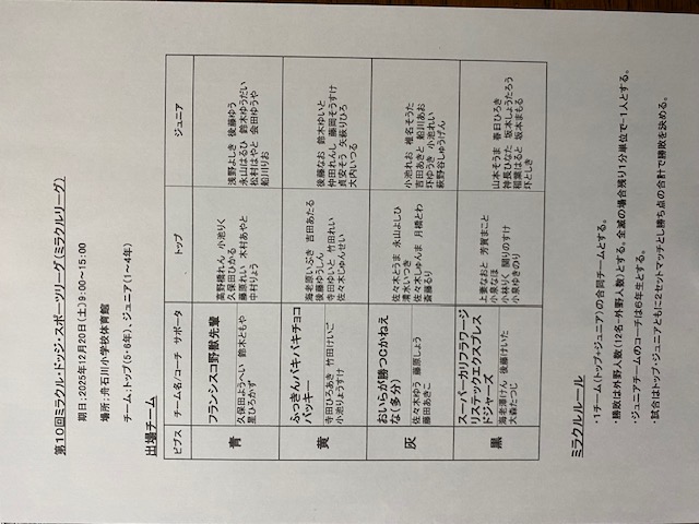 内容;1チーム構成をジュニア(1~4年)・トップ(4・5・6年)に分け4チームによるトーナメント戦を実施する。